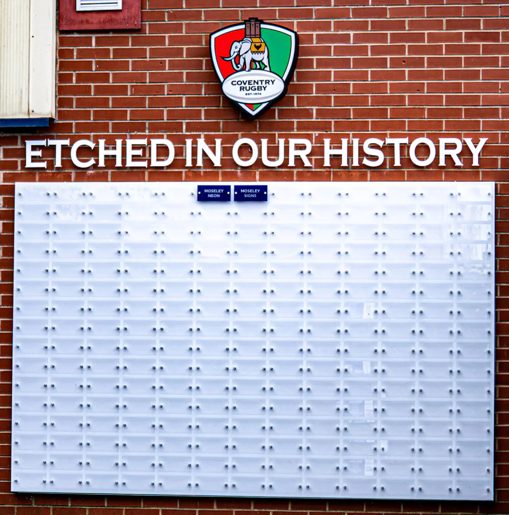 The Etched In Our History wall is more than a display – it’s a celebration of the community that has supported Coventry Rugby since 1874. Every plaque represents a story, a memory, and a connection that strengthens our club for generations to come.