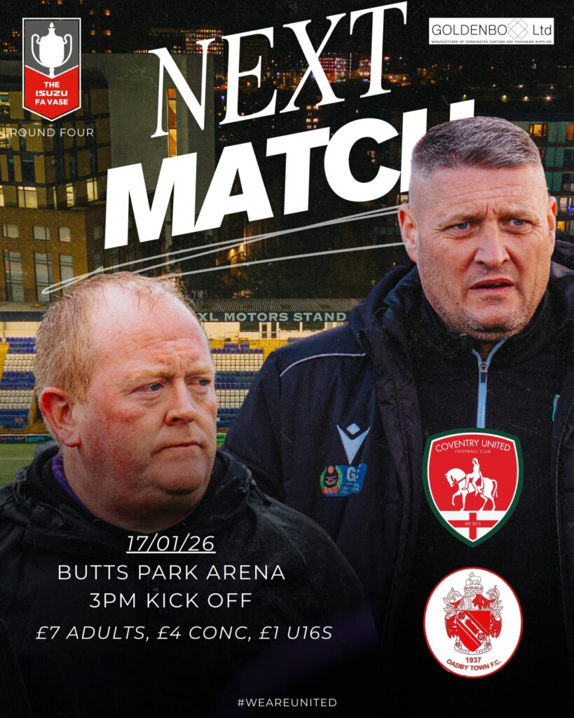 Coventry United welcome GNG Oadby Town to the Butts Park Arena for this Isuzu FA Vase Fourth Round tie.